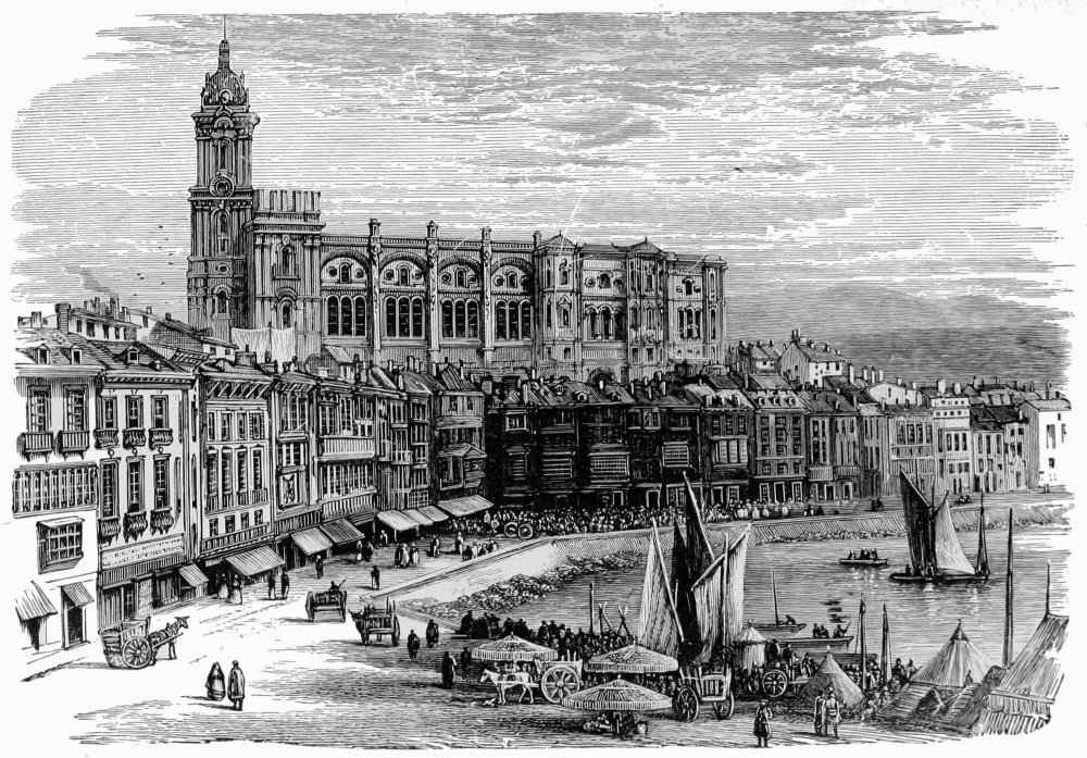 From the balconies and the miradores float damask draperies, striped Moorish stuffs, and wreaths of feathers and flowers; fans wave incessantly in the heavy air, and long black mantillas fall over eyes lustrous under meshes of coal black hair—to the wild ringing of every bell in the city, led by the boom of the Giralda, and petards exploding as of a city taken by assault.