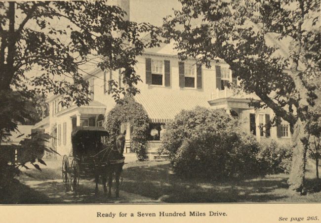 These recollections have been put together on the cars (literally at railroad speed), without reference to diary, home letters, map or guidebook, and briefly outline our nine journeys and about three thousand miles’ driving. We have told you very little of our every-day enjoyment. The perfect ease and safety with which we have accomplished this we attribute mainly to extreme caution and constant consideration for our horse, and we are full of courage for the future. We have friendly invitations from Maine to Colorado and Wyoming, and trust we may be spared to visit at least one of these points, when we celebrate our tenth anniversary.