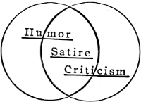 When we say, however, that satire is a union of those two intangible, subjective elements, criticism and humor, we do not assume the equation fully to be expressed by the formula—Antagonism plus Amusement equals Satire. For neither is all criticism humorous nor all humor critical. The relation is that of two circles, not coincident but overlapping.