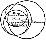 Confusion has arisen because, while the boundaries of the two separate circles are fairly distinct in our minds, the circumference made by their conjunction is merged in their respective planes. Accordingly, the term satire is sometimes used to denote humorless criticism,—which is really invective, denunciation, any sort of reprehension; and sometimes uncritical humor,—which is mere facetiousness and jocularity. Not every prophet, preacher, or pedagogue is a satirist, nor yet every merry clown, or exuberant youth, or mild worldly-wise man enjoying the blunders of innocent naïveté.