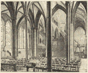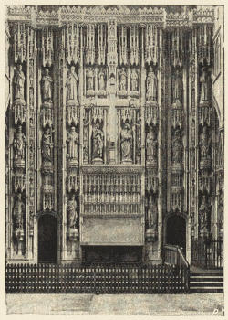 In a cathedral with a fully-developed plan,—e.g., St. Alban’s or Winchester—the following ritualistic divisions will be met with in passing from west to east:—(1) The nave; (2) the choir; (3) the sanctuary; (4) the retro-choir, containing (a) processional aisle, (b) Saint’s chapel, (c) ante-chapel or vestibule to the Lady chapel; (5) Lady chapel. Sometimes these ritualistic divisions correspond with the architectural divisions of the church; sometimes they do not: e.g., the ritualistic divisions of the eastern limbs of York and Lincoln were not shown in the structure, but merely marked off by screens, most of which have been destroyed.