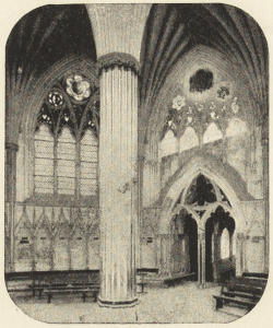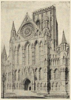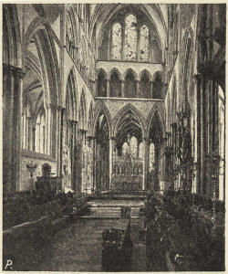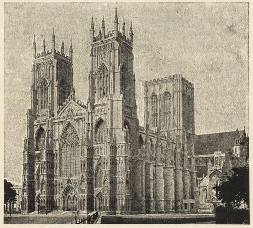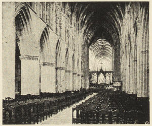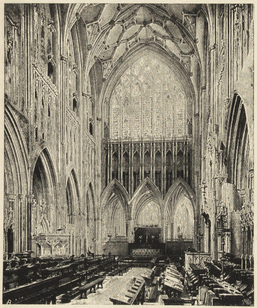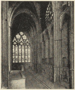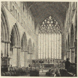 But the original Norman cathedrals were not only small and inconvenient to the east, but they were throughout very badly lighted; a very large amount of history, as I have tried to point out in speaking of Gloucester, Hereford, and Norwich, consists of attempts to improve the lighting of the cathedral. Sometimes, indeed, the improvement took the shape of total destruction of the old gloomy church, and its replacement by a brilliantly illuminated successor, as at York. Connected with this was the mania for an increased acreage of stained glass—an æsthetic motive which, however, had its practical side; the stained glass justifying itself to the monks and canons as providing a series of lessons in Scripture history or Church history.