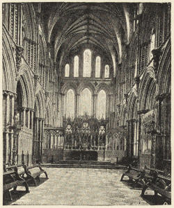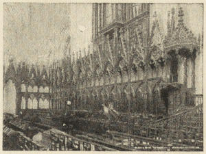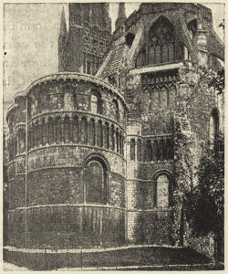 Saint-worship increased; pilgrimages increased; pilgrims[viii] came in thousands and tens of thousands. They could not be accommodated in the crypts as before: room had to be found on the floor of the choir for shrines transferred from the crypt; and aisles had to be constructed round the shrines, that there might be a free passage, and no dangerous block in the stream of pilgrims. For the local Saint—the St. Thomas of Canterbury, the St. Hugh of Lincoln—accommodation on a vast scale had to be provided. But beside the local saints, there were the great saints of the Church; for them special chapels, with altars, had to be provided, either in a new eastern transept or in aisles added to the central transept. There was, moreover, especially in the first half of the thirteenth century, a great outburst of Mariolatry. For these reasons, then—what we may call ritualistic reasons—vast eastern extensions were made in nearly every cathedral.