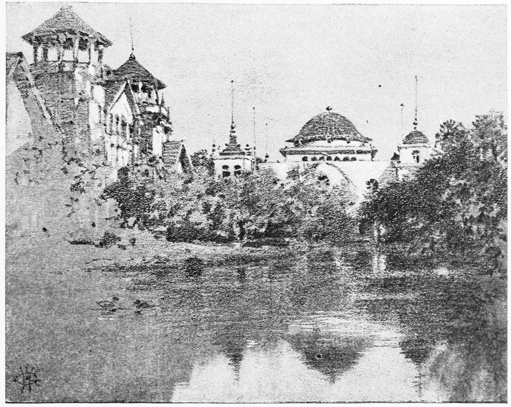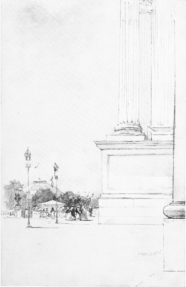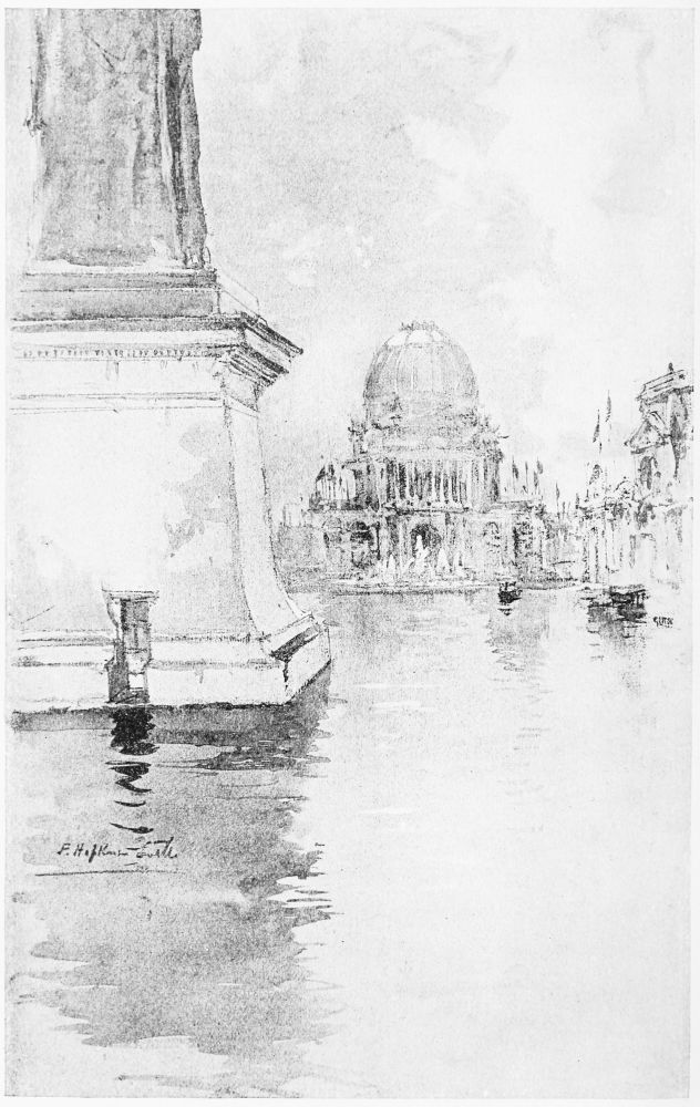enjoy it, rise obedient to one’s thought in aftertime. Such a memory is that of a first sunny morning in Paris: a ride from the Madeleine across the Place de la Concorde, along the Tuileries Gardens and the Louvre, across the Seine with the island and Notre Dame in the distance, and then through older Paris to the gardens of the Luxembourg. Or again, a certain early moonlit evening in Florence, with the Duomo looming at the end of the street, Giotto’s Campanile standing sentinel at its side, the narrow street to the Piazza della Signoria with its Palazzo Vecchio and the Loggia dei Lanzi, thence by the side of the Uffizi to the Arno and across the Ponte Vecchio up to the Pitti Palace. These memories, common to so many, are often gained on ground made familiar through study of guide-books and photographs which, instead of dulling realization, add to it the zest of more thorough appreciation. In like manner, study, discussion, photographs, and engravings prepare one for the Columbian Exposition; but the first few hours of living in its architectural dreamland gives reality to the shadowy preconception, and adds the priceless gift of another masterpiece to memory’s picture-gallery.