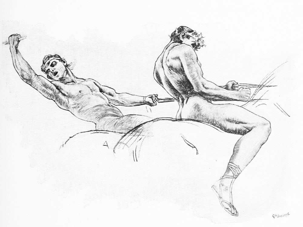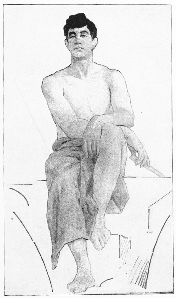 From the corner of this balustrade a red rag of {101}an awning, torn from an old tarpaulin, is stretched to an oar, its black shadow spilling down the white steps. Under this awning, flat on his back, sound asleep, lies a gondolier, fresh from Venice. Despite his nondescript costume of brigand’s leggings and cavalier’s cap I cannot mistake that broad chest and sunny face, the crisp black hair, and the fine lines of the throat and thigh.