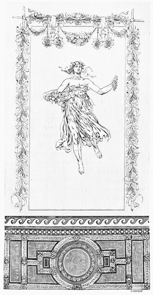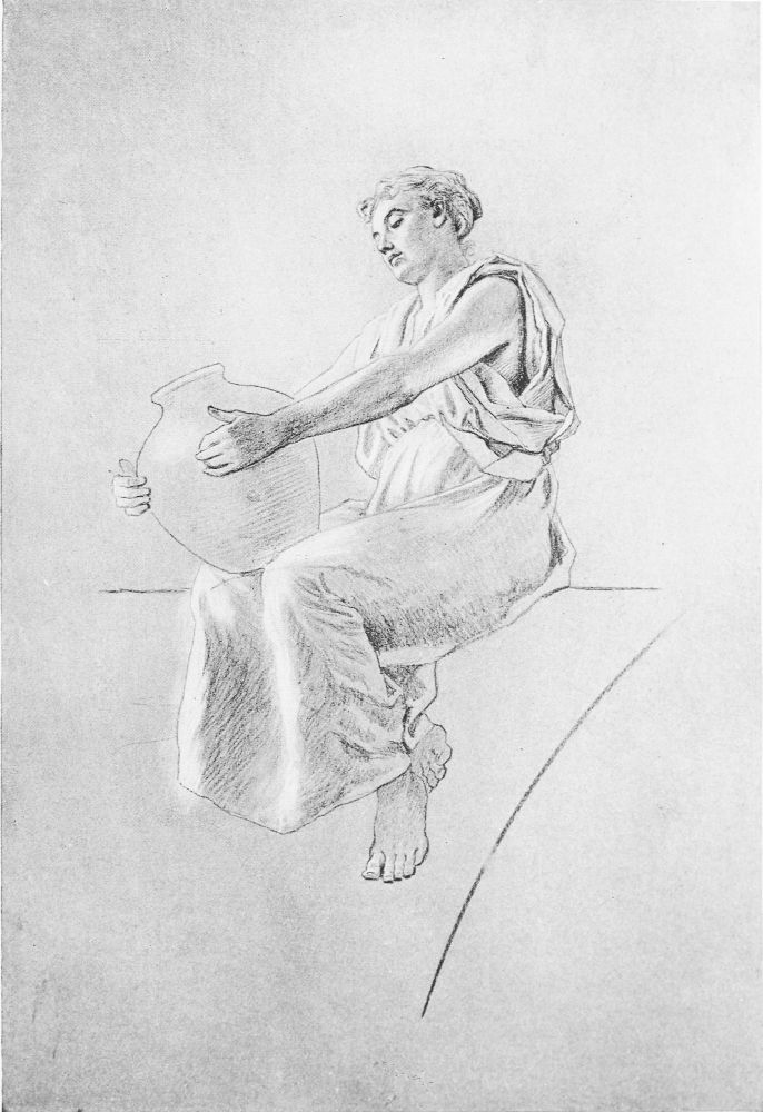 to the purposes of the building, the architecture, and the construction of the pendentive dome itself. A white-marble terrace describes a complete circle just above the four arches of the dome, the railing of which is a repetition of the actual one which finishes the top of the walls of the building itself; above a vibrating blue sky, with touches of salmon pink; in the pendentives four seated female figures, representing the Arts of Sculpture, Decoration, Embroidery, and Design. Between the figures and above the arches are urns with cactus, from which vines and flowers are trailing, thus uniting the composition. The treatment is mural—broad, flat tones within the severe contours. Above, in the sky, faint in color and harmonizing with the sky itself, four cherubs are having a merry-go-round with pale ribbons.