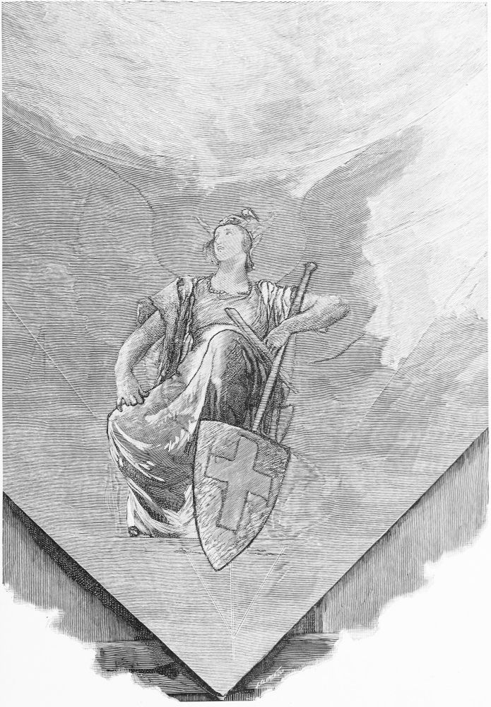 The pendentives of the adjacent dome, painted by Mr. E. H. Blashfield, are filled by four winged genii, representing the “Arts of Metal Working.” The “Armorer’s Craft” is personified by a helmeted figure; the “Brass Founder” and “Iron Worker” by two half-nude youths, one holding an embossed trencher, the other a hammer, while a maiden, in the closely clinging gown of the fifteenth century, with a statuette in her hand, symbolizes the “Art of the Goldsmith.” The extreme points of the pendentives are filled by appropriate attributes, a{36} pair of gauntlets, brass workers’ tools, a horse-shoe, and a medal. Behind the figures, and a little above their heads, is a frieze of Renaissance scroll work, and the whole composition is bound together by flying banderoles and by the sweep of the widely extended wings. The centre of the dome is occupied by two winged infants supporting a shield. The general color scheme comprises a series of peacock blues, greens, and purples, brilliant white tones in wings and frieze, and pale blue of the sky as a background to the composition.