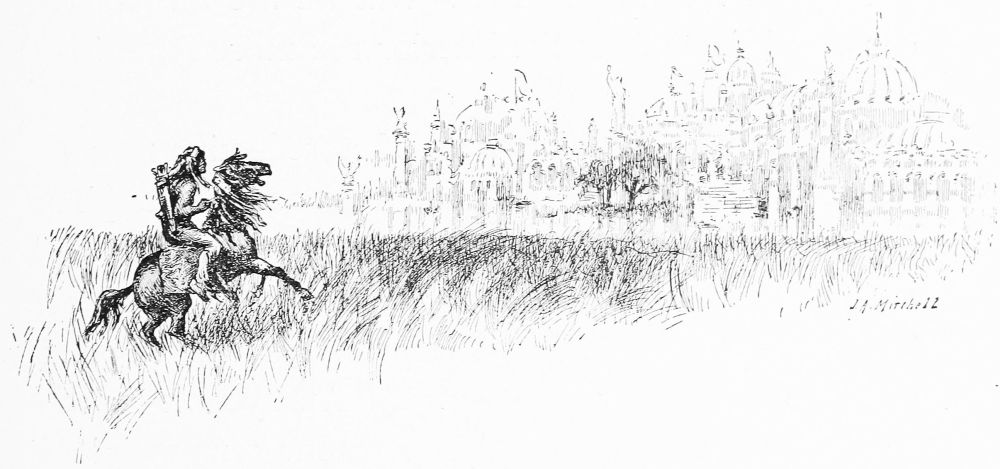 If the native Indian were of a reflective turn of mind, all this might awaken unpleasant thoughts. Judging from outside appearance, however, he has no thoughts whatever. He stalks solemnly about the grounds with a face as impassive as his wooden counterparts on Sixth Avenue. And yet he is the American. He is the only one among us who had ancestors to be discovered. He is the aboriginal; the first occupant and owner; the only one here with an hereditary right to the country we are celebrating. Perhaps the native realizes this in his own stolid fashion. As he stalks about among the dazzling structures of the Fair, and tries, or more likely, does not try, to grasp the innumerable wonders of art and science that only annoy and confuse him, it may require a too exhausting mental effort to recall the fact that his own grandfather very likely pursued the bounding buffalo over the waste of prairie now covered by the city of Chicago. He, at least, if his education permitted it, could claim historic connection with the country when Columbus came so near discovering it; whereas our own connection with the discoverer is certainly remote, and sometimes suggests (with the fact that he from whom we have{45} named the Fair never actually saw this particular country) that we are taking liberties with his name.