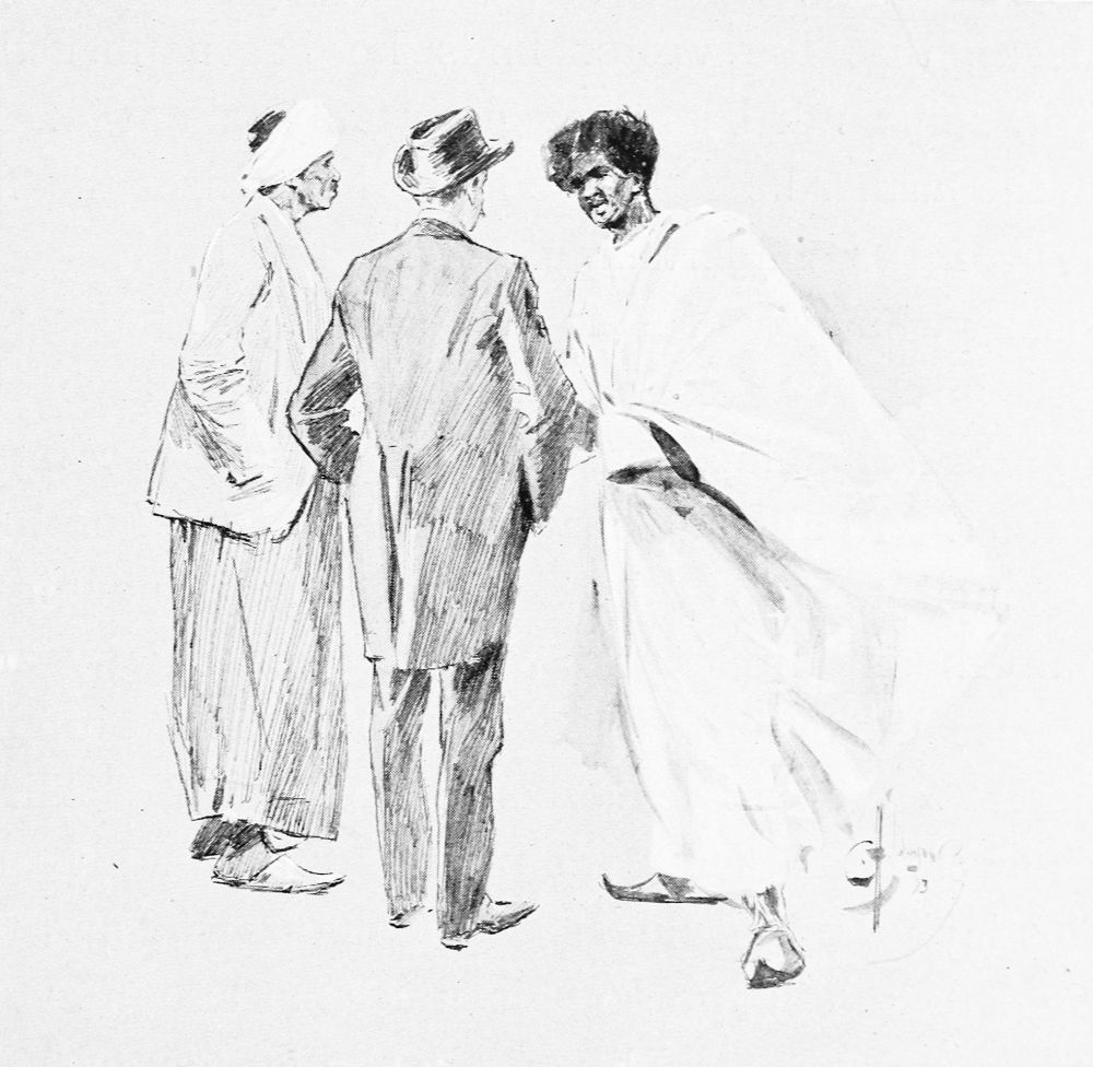 As you are still in search of the picturesque, follow that barefooted Arab with fez and long yellow gown, who has just saluted with such respect and humility Roberto Levy (chief commissioner of all these Muhammedan people), touching his heart and lips and forehead after the manner of his race. He has some complaint to make or grievance to right. You note that the man enters a gate farther down{119}