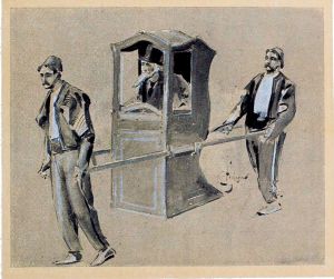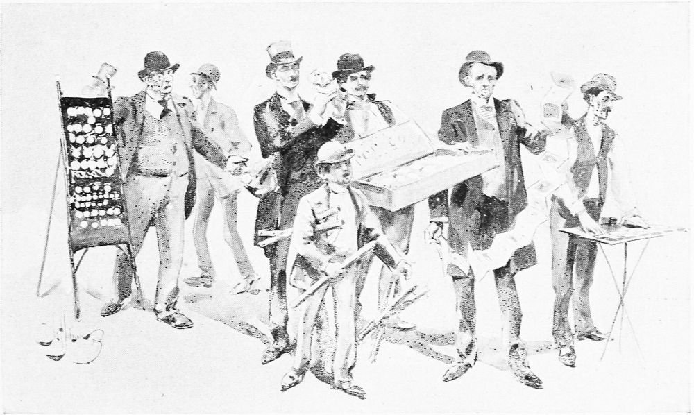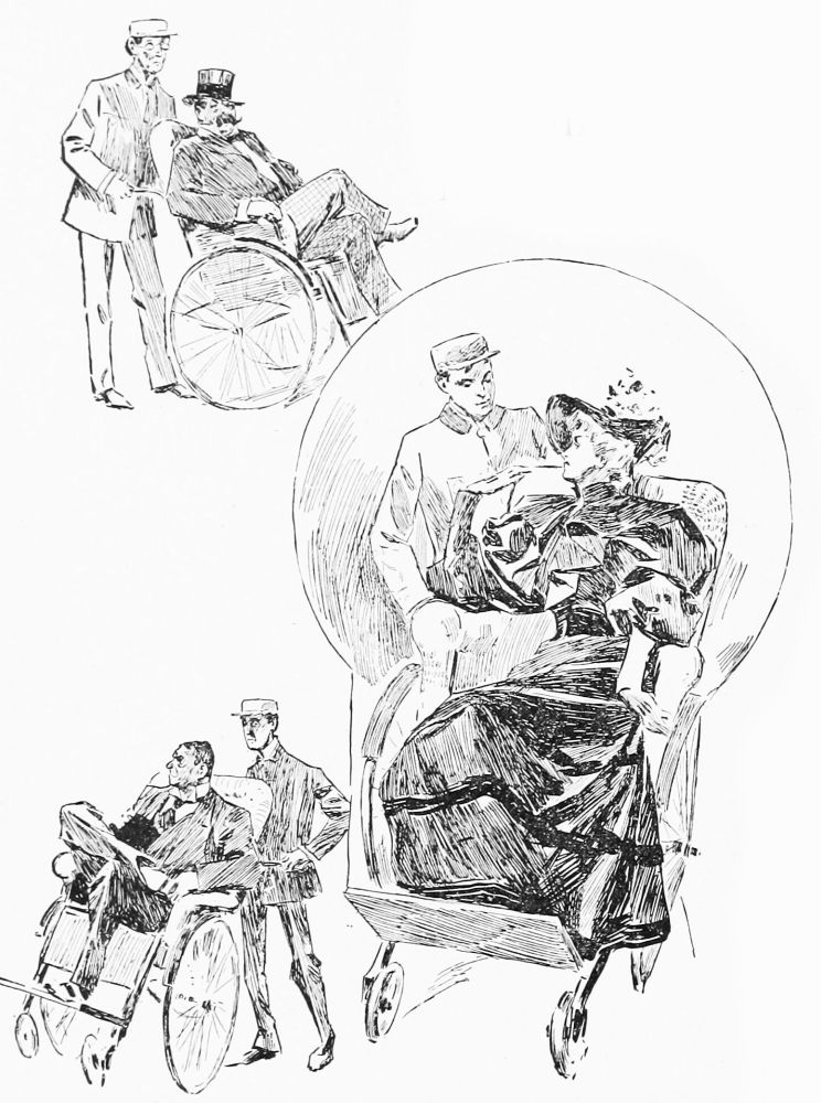 The rolling-chairs that run about the grounds and through the buildings are the salvation of many a fainting spirit. To thousands of human beings with nothing but a human back and human legs the fair would be a failure without them. They are support for the weary, strength for the weak, and hope and a new life for the despairing. The guides who navigate them are, as a rule, college students, profiting by this opportunity to see the fair and to secure additional dollars toward completing their studies. The result is, for the occupant of the chair, an intelligent and agreeable companion, who is ready and willing to give any information he may possess. And besides, they are neither sharks nor liars, but fair and honorable respecters of truth. There is sometimes a contrast in manners and education between the occupant of the chair and the man behind that is not in favor of the former. When one sees what is evidently a citizen with far more money than{54} brains, and without the faintest appreciation of the beauties that encompass him, wheeled about at seventy-five cents an hour by a youth so far his superior that any comparison is impossible, it causes one to realize that Fortune is indeed an irresponsible flirt, who is never so happy as when doing the wrong thing.