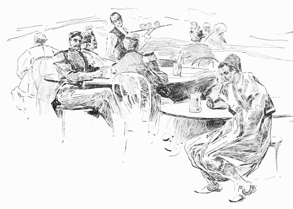 Plaisance. The walls are hung with the wealth of the East. Divans are scattered about. On a low table, octagon-shaped and inlaid with mother-of-pearl and ivory, lie yataghans and Turkish arms, embossed with silver and enriched with quaint design. The light struggles in through the small{115} windows and half defines the odd interior, quite as it does in his shop along the Bosphorus. I throw myself upon a pile of Eastern rugs and begin adjusting the pillows in true Oriental fashion.