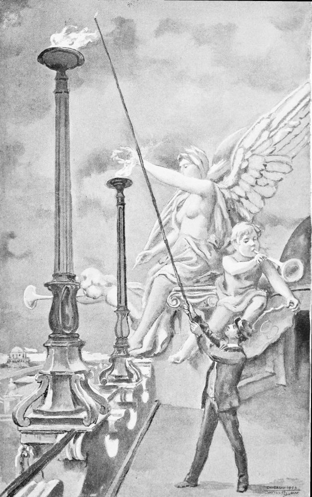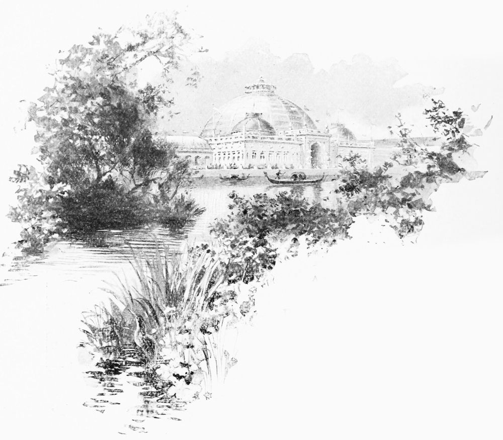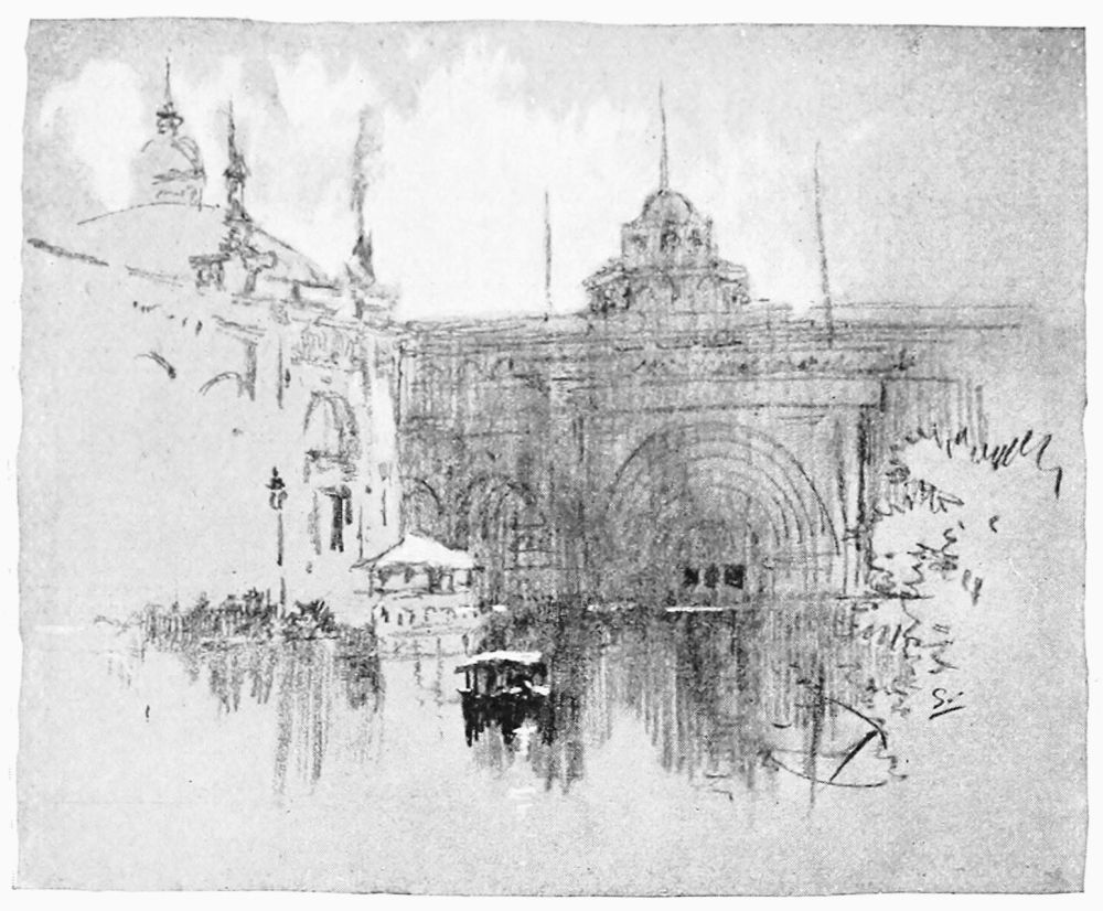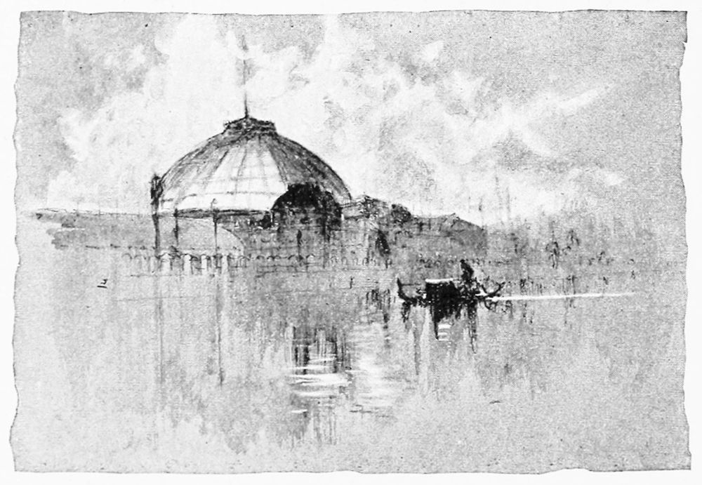 A BLAZING sun and a clear limpid sky, a long lagoon, gray-green and silver, a noble flight of steps serving as water-landing for half a dozen gay-colored gondolas, a grand balustrade protecting a broad platform leading to the porch and entrance of the most exquisitely beautiful building of modern times—the Art Palace of the Great Exposition!