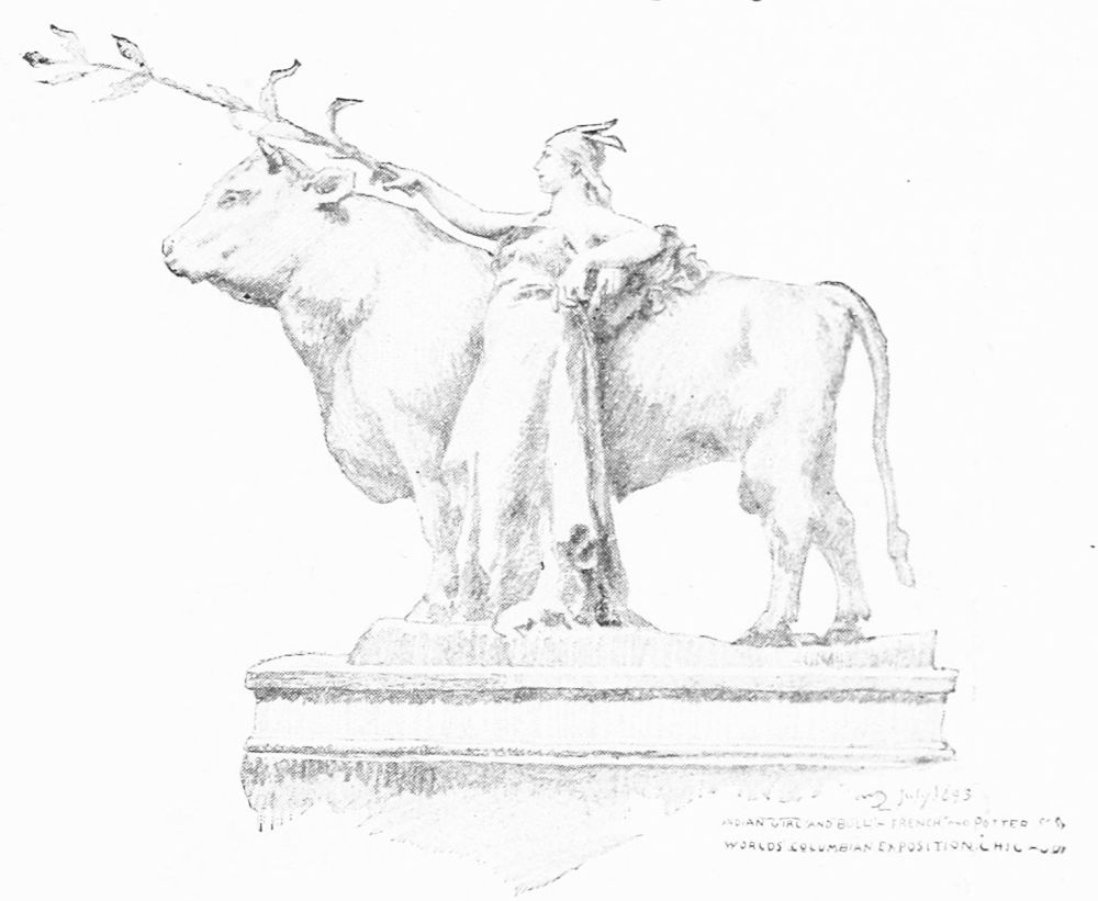 Of Mr. Saint-Gaudens we have only a figure of Columbus, which he has signed in collaboration with another of his pupils, Miss Mary G. Lawrence. It is a good exemplification of what has already been said that at the first glance this figure seems almost out of place here. It is of a character—the highest character—of work which depends on the most serious study. Conception and pose are reduced to the simplest, almost archaic form, and while it does not seem quite as successful, it is of the same family as the Lincoln here in Chicago or the Deacon Chapin{77} in Springfield. The best of the sculpture here, while subject to the limitations twice mentioned, has perhaps gained a quality more essentially American by the absence of what may be called the ready-made decorative quality. The quadriga on the Peristyle, by French & Potter, the Indian girl and the bull, and indeed all the figures and animals at which these artists have worked together, are thoroughly satisfactory as decoration, and more native and appropriate to our soil than the lighter touch and greater facility of the sculpture at the exhibition on the Champ de Mars would have been.