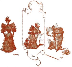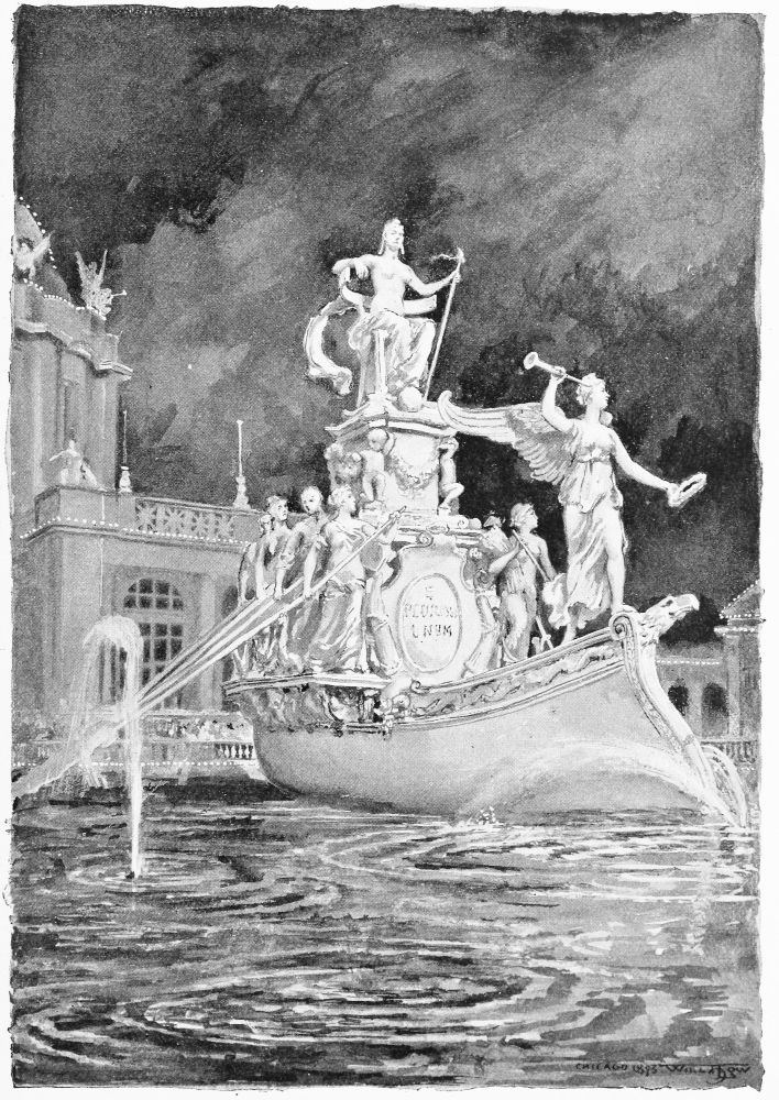 Night and electric light play a great part in the spectacular side of the Fair. Solomon in all his glory never saw such a sight as the plain people of this continent have had on illumination nights this summer. Innumerable incandescent lights sparkle along the cornices and pediments; the top of the wall inclosing the grand basin is outlined in fire; search-lights from the top of the Liberal Arts building cut their wide swaths of light in gigantic circles, resting for a moment here and there to bring out now this detail or to throw into dazzling relief a{73}