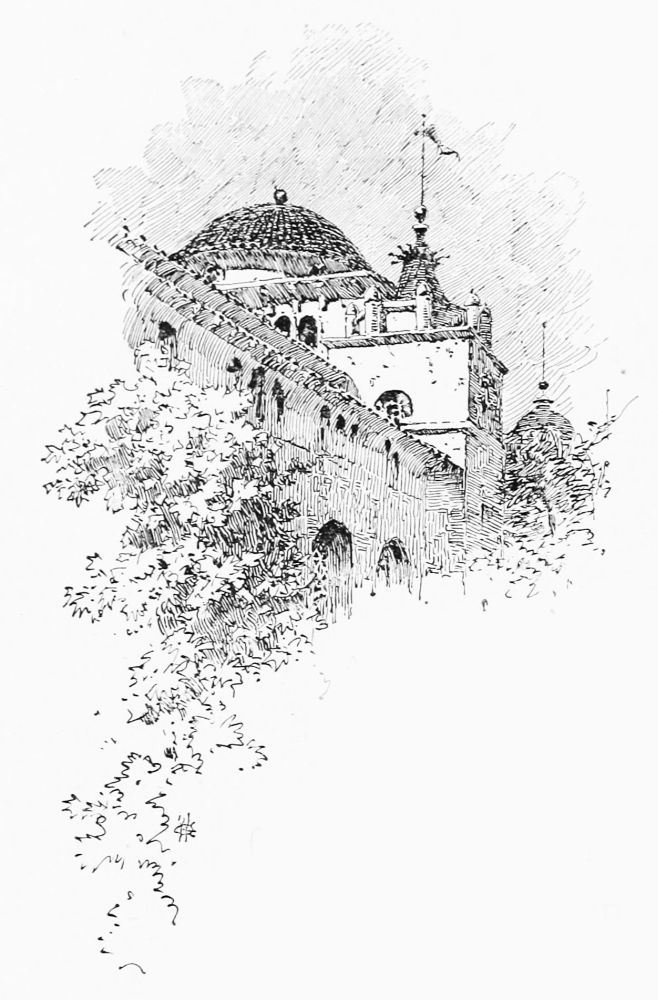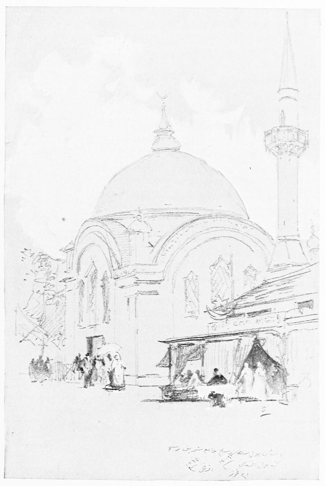 Near the entrance to the Turkish village, tucked away on one side of the highway, just out of the rush of the never-ceasing throng, and yet close enough to be within call, rises the dome of a small{111} Mosque. Above this a single, snow-white minaret shoots up into the blue.