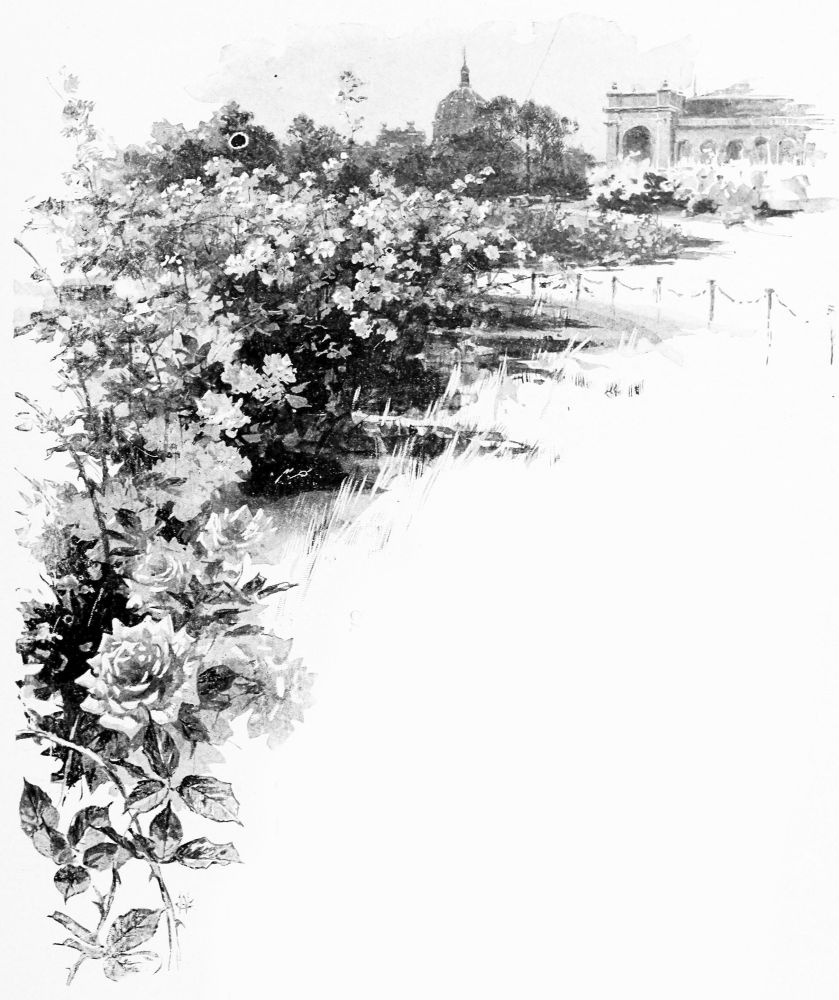 The now famous rose-garden lies in the southern end of the island, approached through winding walks, garlanded with flowery shrubs of every habit and hue, of graceful blossom-burdened spiræas, drooping as with a weight of snow, or varied with rare foliaged plants which vie with the flowers in the endless play of their brilliant colors. Through the skilful foresight and planning of Mr. John Thorpe, the custodian of this realm dedicated to Flora, the fair goddess has crowned him with a new decoration of wreath or laurel for every week,{92} from the earliest yellow glow of May to the brilliant maples and the final autumnal glory of the chrysanthemum.