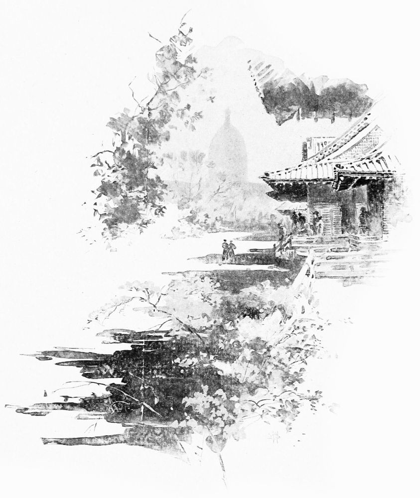 The long, low-roofed, wooden temple is surrounded from its foundation by a characteristic terraced garden, embracing many examples of those{93} “precious goods done up in small parcels,” which have always been the particular fad of the Japanese horticulturist—tiny giants of trees, so to speak, arranged in miniature parks, which, for the moment, make the beholder seem to be upon a mighty cliff or in flight with the soaring falcon, else how could he thus gaze down upon the summit of such a huge, lofty pine as this which he now sees beneath him! A fine example of one of these arboreal paradoxes is to be seen in the Japanese exhibit in the Horticultural Building—an aged dwarf of an arbor vitæ (Thuja) like a gigantic cedar of Lebanon, which, while having all the inherent characteristics of an actual age and dignity of over one hundred years, is still, with the big vase which it occupies, barely the height of one’s shoulders.