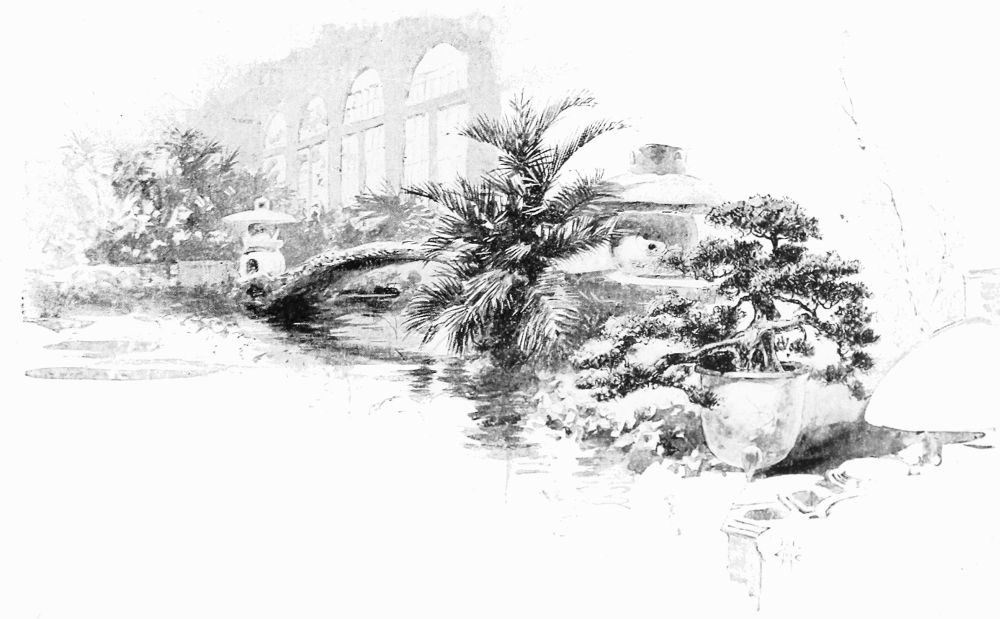 Japonica! Japonica! How continually does the spirit of the flowery land hover here! It is, indeed, scarcely a surprise that the actual, familiar outlines of its quaint massive gables suddenly confronts us, looking down above a mass of the Mikado’s own chrysanthemum, and we suddenly find ourselves transported to Tokio or Yokohama, surrounded by a veritable epitome of Japan, embracing all the actual features, floral, ornamental, and utilitarian, with which, through the educational influence of painted fan and screen and household gods of vase and kakemono, we have become so pleasantly familiar.