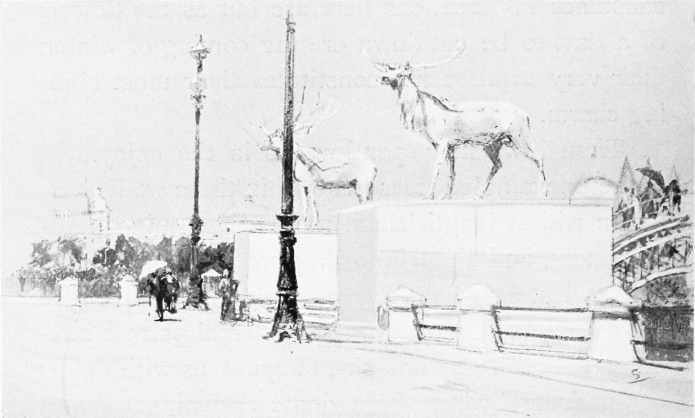 The terraces afford another inviting field for open-air decoration. Numerous pedestals have tempted the skill of the sculptors of the Quadriga to produce distinguished types of the horse and the bull, and formal antique vases on the balustrade and reproductions of the masterpieces of ancient statuary break the long lines of parapet and greensward. The graceful bridges spanning the canals are guarded by sculptured wild animals native of the United States, part of them by Mr. Edward Kemeys, others by Mr. A. P. Proctor, in appropriate contrast to the classicality of their surroundings and suggesting future possibilities in sculpture inspired by similar motives. The eye cannot take in at a glance the sumptuous beauties of this grand court, even in its ragged state of partial finish, but roves from statue to column,{26} portal to terrace, resting agreeably on broad masses of rich color and on the gleaming reflections in the basin. Imagination can scarcely picture the scene with the addition of the festal features of fluttering banners, rich awnings, gayly decorated craft giving life and movement to the water front, and everywhere the crowd of visitors all on recreation bent.