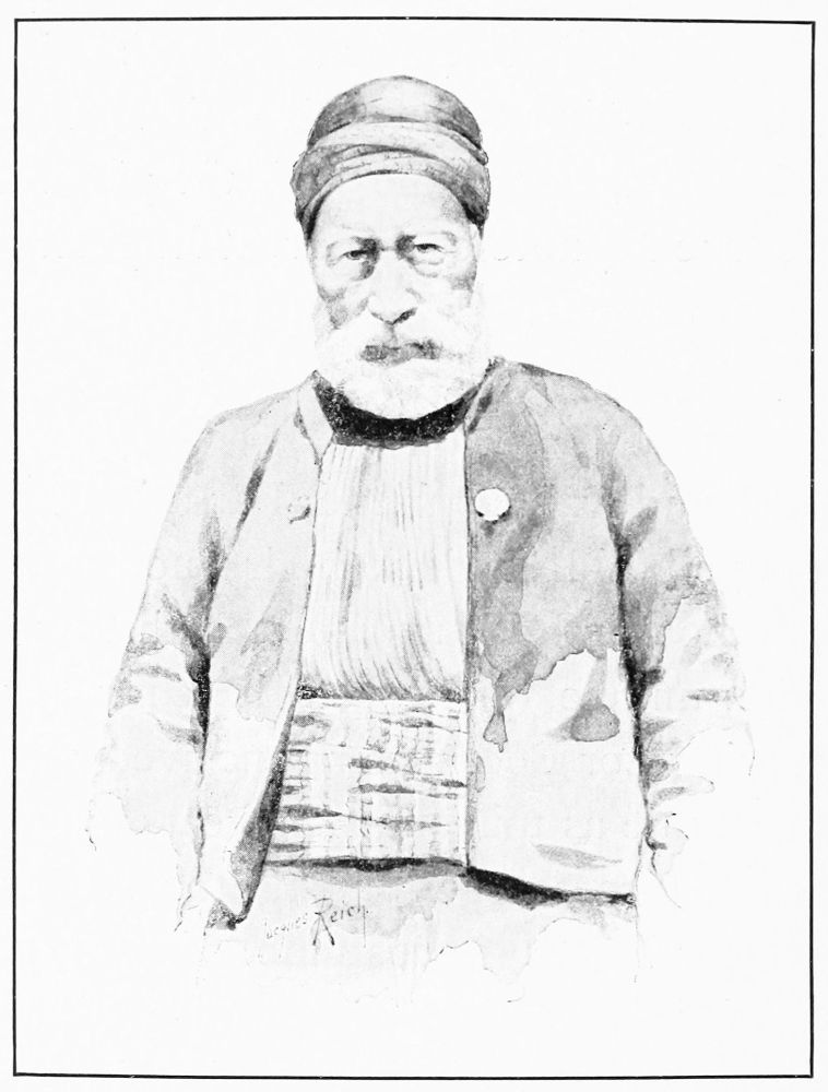 My old and valued friend, Far-away Moses:—What a superb old Shylock he is; not in the sense of “three thousand ducats and for three months,” but in the unique quality of the character itself! Neither Irving nor Booth ever conceived so fine and fitting a costume as this old man wears every day in and out of his bazaar, and along the streets of his transplanted village; a costume of soft material, with an under-vest delicately embroidered, the over-jacket a coat of brown camel’s-hair with dark red voluminous waist-sash and the wide Eastern skirts covering his still sturdy legs.