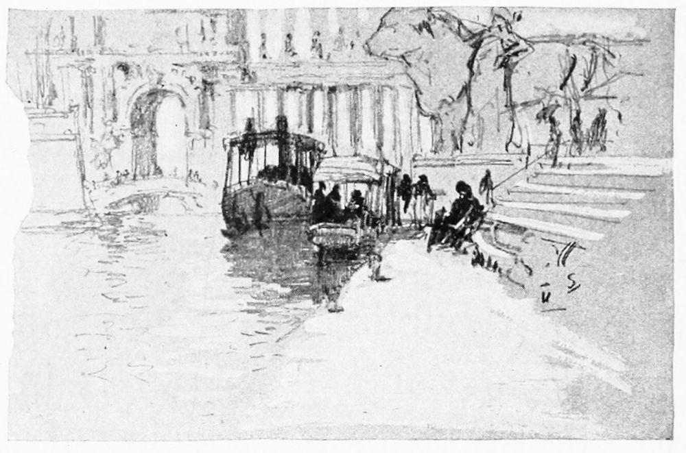 and landscape gardeners in the general plan. Especially is this charm felt in the absence of rectangular lines of construction; in the winding in and out of the lagoons; in the neglected fringing of untrimmed foliage skirting the water’s edge; in the half submerged bits of islands where the ducks plume their feathers; in the informal formality of great massing of plants; in the dotting of broad stretches of gray-green water with gay-colored gondolas; and in the colossal proportions of superb decorative statues, so that a glimpse of Venice can be caught between the forelegs of a huge sculptured bull, and the columns of a classic temple be outlined over the back of some water-sprayed mermaid.