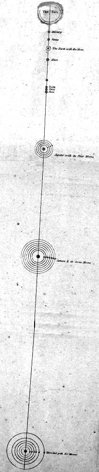 You will now easily understand what the straight line means, which, in plate No. III is drawn through the centre of the circle, which represents the Sun; also the straight lines which are drawn through the circles which represent the Planets.—You will also perceive from the first figure on plate No. III, that the Sun’s Diameter is larger than the Diameters of all the Planets taken together.