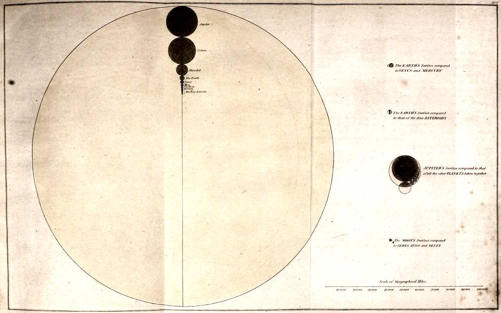[§ 12.] What proportion does the square-Contents of the Sun’s surface bear to that of the surfaces of all the Planets? What two Planets have together a surface nearly as large as that of our Earth? Are the surfaces of Ceres, Vesta, Juno and Pallas taken together sufficient or not, to cover the surface of our Earth? What Planets, therefore, could be covered with the Earth’s surface? Which Planet has the largest surface? What do you observe with regard to the square-Contents of[Pg 8] Jupiter’s surface? and that of the surfaces of all other Planets, taken together? What Planet’s surface comes next in magnitude to Jupiter’s? What Planet’s surface is larger than that of our Earth, Venus and Mercury taken together? What three Planets’ surfaces taken together are smaller than that of the Moon? What Planet has nearly as large a surface as the Moon?