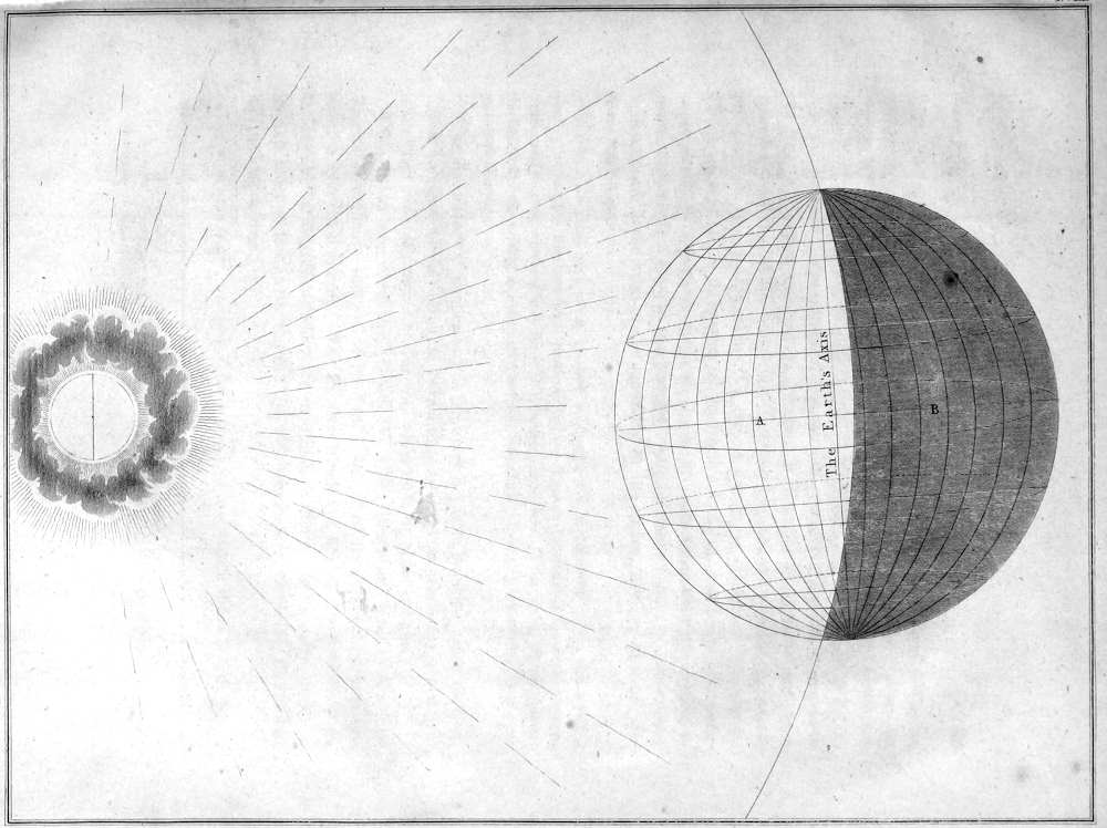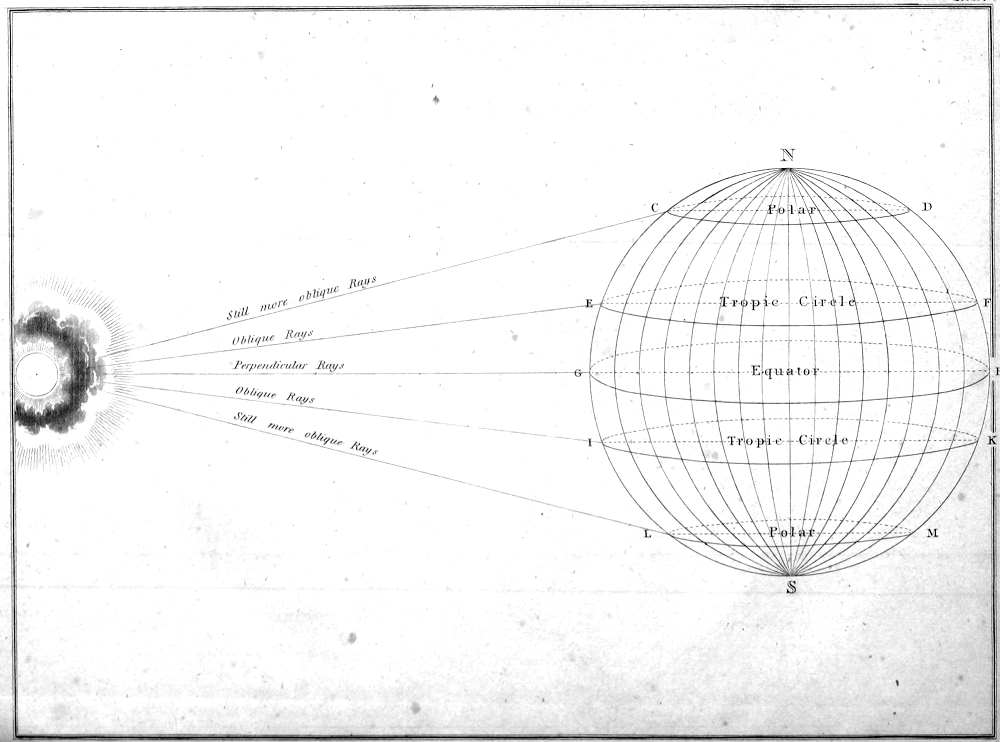You will see from it that the Sun’s rays are perpendicular to the central part of the Earth’s surface; but that toward the extremities of the Earth’s Diameter these rays strike us more and more obliquely. The greatest heat, therefore, must be felt by the people living between the two circles EF and IK. The circle GH, which is exposed to the perpendicular rays, is termed the Equator; and the two circles EF and IK, which are at equal distance from the Equator, are called Tropic Circles. The whole surface included by these two circles is called the torrid Zone. The space between either of the circles CD and EF, or IK and LM, is called a temperate Zone; because the Sun’s rays striking these portions neither perpendicular nor very obliquely, their inhabitants suffer neither great heat nor cold. In one of these Zones are situated the United States of America and the greater portion of Europe. Beyond them, toward the extremities of the Diameter AB, are the two icy or arctic zones. The Sun’s rays strike them very obliquely; which is the cause of their being almost continually covered with ice or snow.