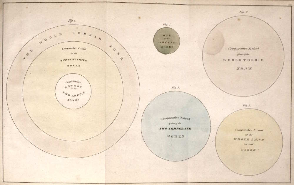Fig. I represents the surface of the Earth divided proportionally into its three zones: the torrid, the temperate and the arctic. The inner circle represents both the arctic zones; the yellow ring b, which surrounds it, represents the united extent of the two temperate zones; and the outmost red ring, the whole of the two torrid zones.