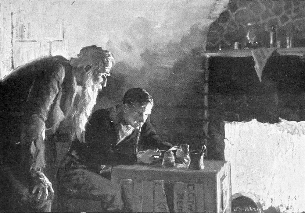 They were all three weeping copiously, for that matter; smoke tears they were, but none the less blinding for all that. Rubbing their eyes, they stumbled down into the cavern, little Purdick with his gun up and ready to fire. At the mouth of the mine tunnel they were met, not by a trio of murderers ready to shoot them down, as they fully expected, but by an apparition—a tall old man, white-haired and with a snowy beard reaching almost to his waist.