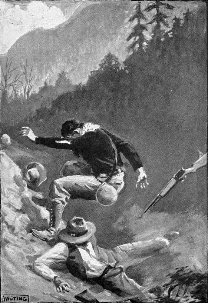 Little Purdick’s face was white and drawn, but his hands did not tremble when he took careful aim at the leading one of the two scrambling climbers. “Don’t kill him if you can help it,” Larry cautioned, and as he said it, the small-calibre rifle spoke. For an instant it seemed as if Purdick had missed. Then the leading man—it was the black-whiskered one—stooped to clasp his right leg just above the knee, wavered for a second, and ended by tumbling backward upon his follower, with the result that both rolled together to the bottom of the slope, knocking the burro and the cripple down as they went.