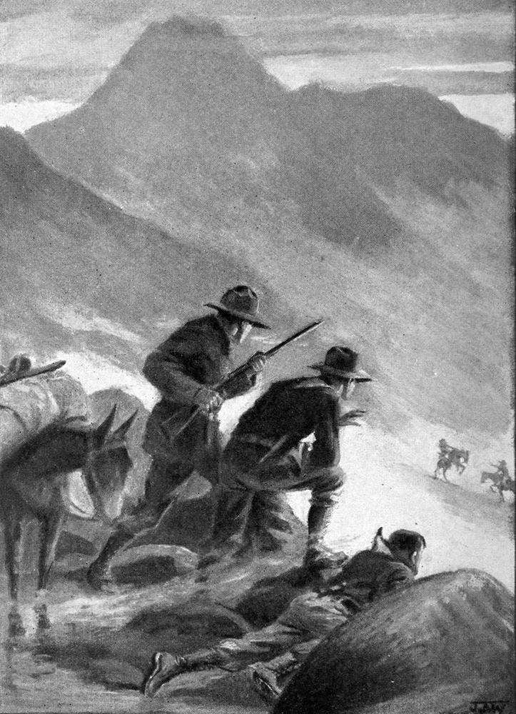The reply to this sportsmanlike warning came so quickly that it seemed as if it must have been planned beforehand. Instantly the cripple dodged behind the trembling burro, and using it for a breastwork and its pack for a rest, opened fire with a repeating rifle, sending shot after shot hurtling up into the crevice mouth, while his two companions, guns in hand, started to climb straight up the slope under cover of this bombardment. Owing to the high angle at which the crippled robber had to shoot, the defenders of the mine were still safe so long as they did not get within the line of fire, and by lying flat on the crevice floor they could see without being seen.