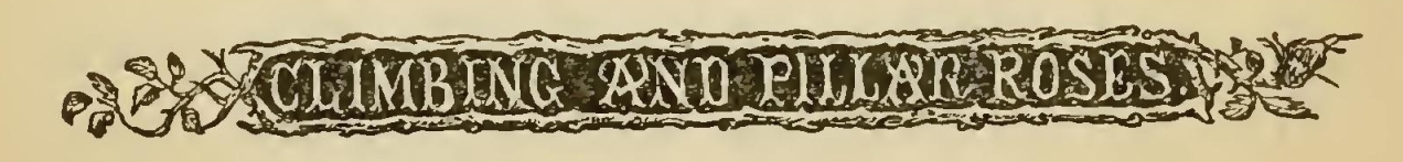 When roses are trained to cover walls, trellises, arches, or pillars, the main stems are encouraged to a strong growth. These form the permanent wood; while the side-shoots, more or less pruned back, furnish the flowers. For arbors, walls, or very tall pillars, the strongest growers are most suitable, such as the Prairie, Boursault, and Ayrshire roses. Enrich the soil strongly, and dig deep and widely. Choose a healthy young rose, and, in planting, cut off all the stems close to the earth. During the season, it will make a number of strong young shoots. In the following spring cut out half of them, leaving the strongest, which are to be secured against the wall, or over the arbor, diverging like a fan or otherwise, as fancy may suggest. The subsequent pruning is designed chiefly to regulate the growth of the rose, encouraging the progress of the long leading shoots until they have reached the required height, and removing side-shoots where they are too thick. Where a vacant space occurs, a strong neighboring shoot may be pruned back in spring to a single eye. This will stimulate it to a vigorous growth, producing a stem which will serve to fill the gap. Of the young shoots, which, more or less, will rise every season from the root, the greater part should be cut away, reserving two or three to take the place of the old original stems when these become weak by age. When these climbing roses are used for pillars, they may either be trained vertically, or wound in a spiral form around the supporting column.