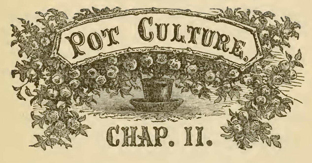 MANY OF the ever-blooming roses cannot, in our climate, be cultivated in the open air without extreme precaution to protect them from the cold. To grow them most successfully, the aid of glass is necessary. Many of the Hardy Perpetual roses may also be grown with advantage in pots, by which means their bloom may be prolonged into the early winter months, or they may be forced into premature flowering long before their natural season of bloom. The first essential in the pot culture of roses is the preparation of the soil. Those of delicate growth, like most of the China and Tea roses, require a lighter soil than the more robust varieties, like most of the Hardy Perpetuals. A mixture of loam, manure, leaf-mould, and sand, in the proportion of two bushels of loam to one bushel of manure, one bushel of leaf-mould, and half a bushel of sand, makes a good soil for the more delicate roses. For the more robust kinds, the proportion of loam and of manure should be greater. In all cases, the materials should be mixed two or three months before they are wanted for use, and turned over several times to incorporate them thoroughly. They are frequently, however, mixed, and used at once. The best loam is that composed of thoroughly rotted turf. A very skilful English rose-grower, Mr. Rivers, recommends the compact turf shaved from the surface of an old pasture, and roasted and partially charred on a sheet of iron over a moderate fire. I have found no enriching material so good as the sweepings from the floor of a horse-shoer, in which manure is mixed with the shavings of hoofs. It is light and porous, and furnishes, in decomposing, a great quantity of ammonia. For the more delicate roses it is particularly suited, while the stronger kinds will bear manures of a stronger and denser nature. The light black soil from the woods is an excellent substitute for leaf-mould; or, to speak more correctly, it is a natural leaf-mould in the most thorough state of decomposition.