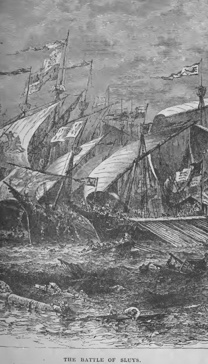 {317}Another occasion caused graver danger to the life of King Edward. The Spanish pirates of the Bay of Biscay were desolating the coast of Flanders and hampering the commerce with England. King Edward resolved to punish their insolence, and, on the 20th of August, 1350, after having cruised about during three days between Dover and Calais, announcement was made of the approach of the vessels led by Don Carlos de La Cerda, the chief of the association of pirates. The engagement began with great fury on both sides. The king had directed his vessel against a large Spanish ship; several leaks had been opened by the shock, and the English vessel was about to founder, when the sailors, making a desperate effort, boarded and seized the enemy's ship, and took refuge upon their conquest. The Prince of Wales, in a similar peril, had been saved by the Earl of Derby. After the victory, which had been dearly bought, King Edward proceeded to rejoin the queen at Winchelsea. Her servants had already brought her tidings of the battle, which they had anxiously watched from the heights. A truce of twenty years was concluded between the King of England and the seaport towns of Castile.
