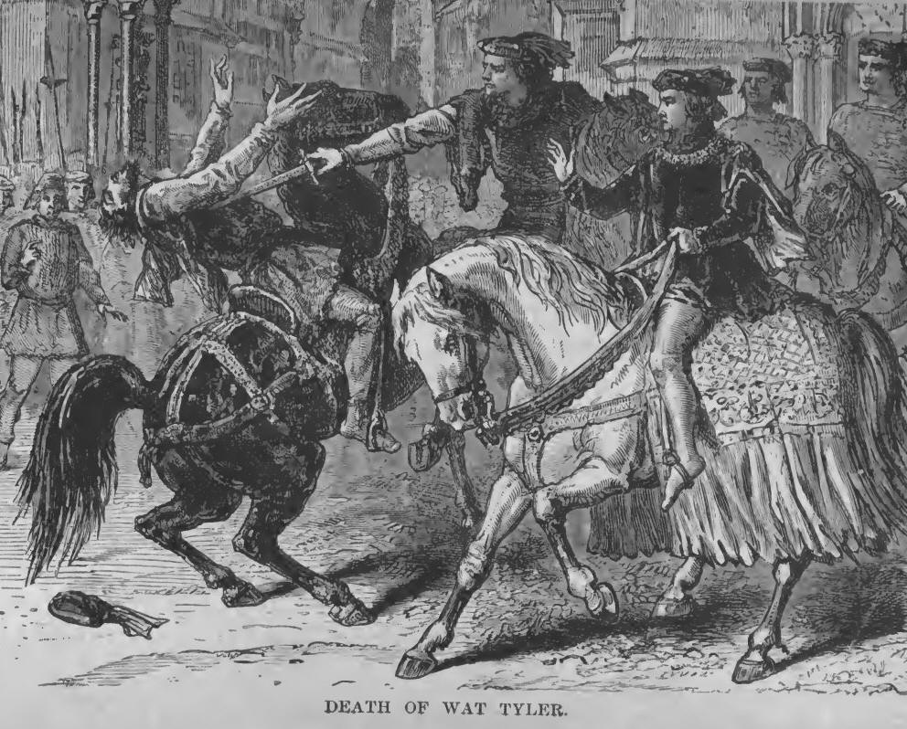 A general movement towards the enfranchisement of the lower classes manifested itself everywhere in Europe. The insurrection of the Jacquerie in France; the resistance of the Flemish citizens and artisans, first, to the conduct of Jacques van Arteveldt and afterwards to that of Philip, his son, had testified to the awakening of the serfs, the peasants, and the artisans, so long reduced to the condition of beasts of burden. The kings had been in need of money, and the taxes weighing upon all their subjects, it had been necessary to conciliate them. The soldiery had acquired a new importance; the English archers, in particular, nearly all peasants by origin, had played an important part in the wars. When the tax-collectors began in 1380 to demand payment of the poll-tax, of a people already impoverished by a long series of exactions, they met with a resistance which increased with the oppression. The tax, at first collected with leniency, was let out to some courtiers; they borrowed in advance of the Lombards and Flemings; repayment became necessary, and the revenue was exacted with great severity. The peasants became exasperated; they began to assemble and confer together; the insurrection broke out in Essex. {342} The "Commons of England," as the insurgents styled themselves, broke into several dwelling-houses in the neighborhood; they obeyed a seditious priest who assumed the name of Jack Straw. The contagion rapidly spread into the counties of Kent, Suffolk, and Norfolk. The tax was payable only in the case of persons above fourteen years of age. A Kentish collector maintained that the daughter of a tiler had attained the specified age; her mother maintained the contrary; the collector insulted the young girl, and was brained with a hammer by the father. A knight had reclaimed a serf who thought he was entitled to enfranchisement, and had imprisoned him in Rochester Castle; the peasants attacked the castle and compelled the garrison to surrender the prisoner. The Kentish insurgents marched under the command of a chief named Wat Tyler (Wat the tiler). On the Monday of Trinity week, in 1381, they entered Canterbury, threatening death to the archbishop, who was absent. The monks of the chapter-house were compelled to swear fidelity to King Richard and the commons of England. Three wealthy burgesses were beheaded, and the crowd proceeded towards London. It is related that one hundred thousand men followed close upon the steps of Wat Tyler, when he arrived on the 11th of June at Blackheath.