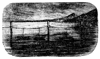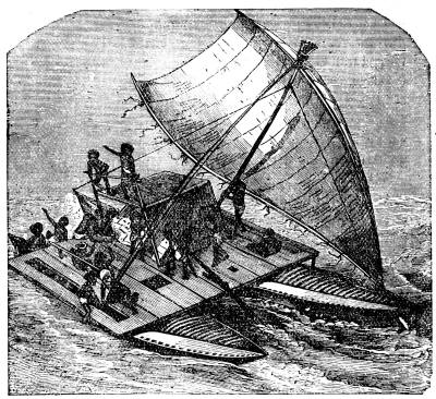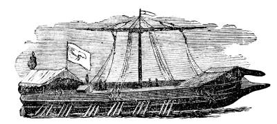 Let us turn, then, from this record of how human ingenuity has been taxed to devise means to destroy men, to the consideration of the new devices made for their comfort or safety in crossing the sea. One of the most useful of these is a life raft or bolsa, one of which is represented in our cut. This consists of three elastic cylinders, made of india-rubber cloth, each twenty-five feet long. When empty they are easily packed[691] in a very small compass. For use they are blown up, and fastened to a prepared staging. The cut represents one which crossed the Atlantic in 1867, arriving at Southampton July 25, having started from New York forty-three days before. She was rigged with two masts secured to the staging, and her crew consisted of three men, John Wilkes, George Miller and Jerry Mallene. A bellows to fill the cylinders, should they require it, was an important item in her cargo. The crew kept alternate watch, sleeping, by turns, in a tent spread on the staging. Their supply of water they carried in casks. The experiment of crossing the Atlantic was made to show the safety of a raft thus constructed.