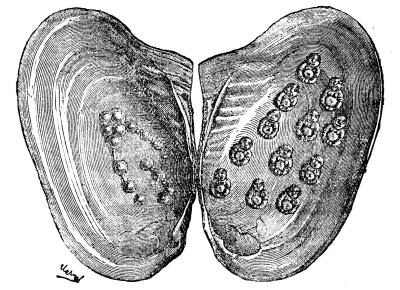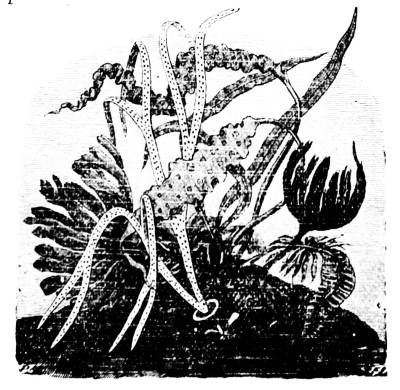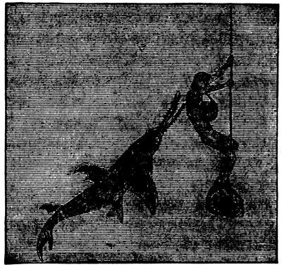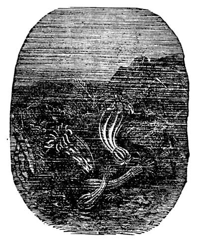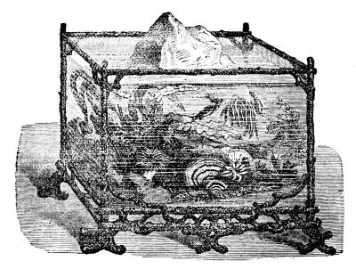 The cut at the head of this chapter, of an aquarium, represents a new appliance of modern times, which is a most valuable aid in our obtaining a knowledge of the habits of the animals living in the sea. In fresh water, as well as in salt, the mutual relations of the vegetable and animal life serve to keep the water from becoming stagnant. The plants secrete the carbonic acid gas, which the animals give to the water by breathing, and in so doing free the oxygen which the animals require. In keeping therefore an aquarium, the desired point is to provide such a natural proportion of vegetable and animal life as shall preserve this balance. In many of the larger[707] museums of Europe, large aquariums have been built, and an opportunity thus afforded for the study of the various animal forms, the habits of the vegetable growths, and their relations. Some of these structures are so arranged that they surround a room which receives its light only through the water in the aquaria, and thus the spectator, without disturbing the fish, can watch them feeding and performing all their actions.