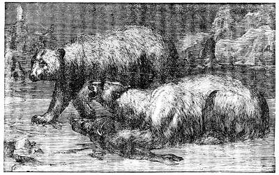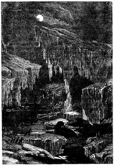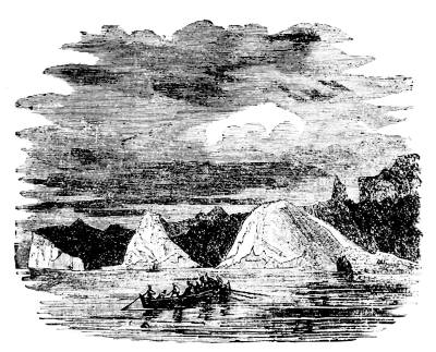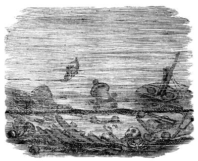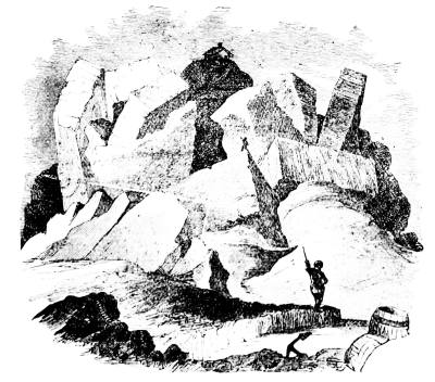 The ocean has thus become almost a steam ferry; almost every day a steamer leaves for Europe. With this knowledge of how far we have progressed in becoming acquainted with the ocean, it will be well to consider for a moment how much still remains for us to explore. In the middle ages, and even down to modern times, the maps of the world represented all unknown lands as inhabited by monsters; but every voyage made by discoverers has contracted the limits of these fables, until they have finally about disappeared. Still at the North Pole and in the Antarctic regions areas extending over a space of 2,900,000 and 8,700,000 square miles, respectively, have been, up to this time, unvisited. The icebergs and mountains of ice have kept them from our accurate investigations. The difficulties of such a sea are well shown in the adjoining illustration.