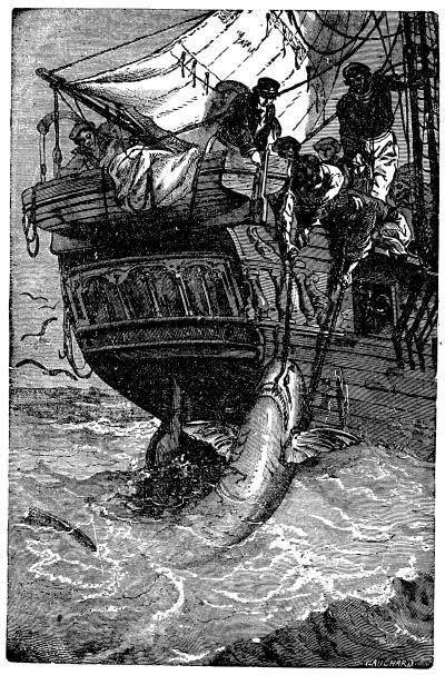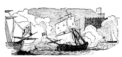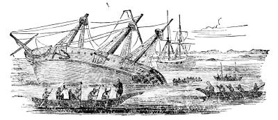 During the whole night the bombardment of the city was kept up, and nothing was heard of the fish boat. The next morning a heavy fog hung over the coast, clearing up about eight in the morning, and the sloop-of-war Housatonic was discovered to be sunk in about six fathoms of water, her crew swarming in her rigging for safety. The fish boat had destroyed her, and destroyed herself in doing so. This was the first time that she had ever been used in exploding a torpedo, and the cause of her destruction is supposed to have been as follows: The weight of the torpedo, on her bowsprit, was balanced by the shifting ballast in her stern, and thus she was kept on an even keel. As soon, however, as the torpedo struck and exploded, the balance was destroyed, her bows were lifted by the weight in the stern, control was lost of her, and the Housatonic, sinking from the damage done her by the explosion, settled upon the "fish boat" and carried her and her crew to the bottom.