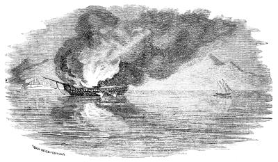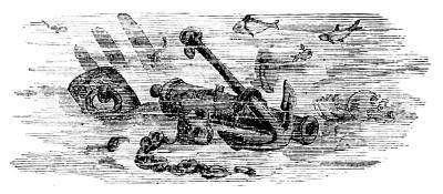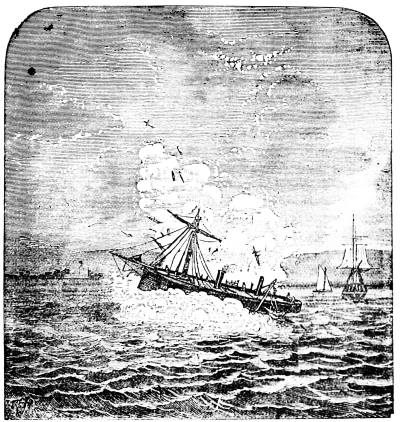 The "cigar boat" steamed silently on its course until within about fifty yards of the Ironsides, without being discovered. Everything on the immense ship seemed as quiet as the grave. Suddenly, in the still night, the lieutenant cries, "Ship ahoy!" "Where away?" is the answer. "We have come to attack you," cries the lieutenant, at the same time firing his fowling-piece, checking the engine, and directing the torpedo. It struck, but before the "cigar boat" could retire, with a gurgling roar it exploded. The explosion sounded like the discharge of a submerged gun. Water mixed with flame was forced by the explosion far up above the gunwales of the ship, and bearing up the bows of the smaller craft, poured back in[688] torrents through the chimney, put out the fires, and rendered the "cigar boat" helpless.