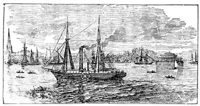 The American ship-builder, however, early saw that the model of his craft, which was to be propelled by steam, should differ from that of a ship depending upon its sails alone, and governed himself accordingly. He made her sharp, for speed, and ended her prow straight up and down, as he built the steamboats for river navigation. The consequence was that she rode dry through waves which would pour tons of salt water upon the deck of an English model. George Steers, of New York, a genius in naval architecture, and whose early death was deeply regretted, was the person who did the most to bring into use the present form used in the best models for ocean steamers. One of his first steamers, the Adriatic, built for the Collins line, excited great attention in Liverpool, when she first appeared there. The London Times spoke of her in leading articles, calling upon the English ship-builders to contrast her with ships of their own construction. It spoke of how she glided up the Mersey, making hardly a ripple from her bows, so evenly and quietly she parted the water, while an English steamer of her size so disturbed the stream as to bring up the mud from the bottom. The Times was also specially struck with the ease with which she was handled, turning almost in her length, while for an English steamer turning was an operation requiring so much more space, and[676] making so much more disturbance in the water. From that time to this the English have followed the American models in the construction and equipment of their steamers, and their example has been imitated by most other nations.