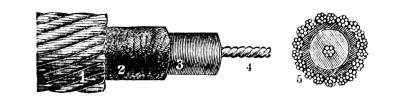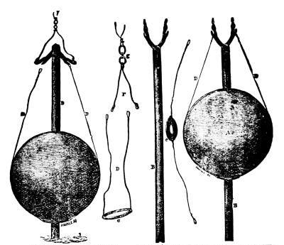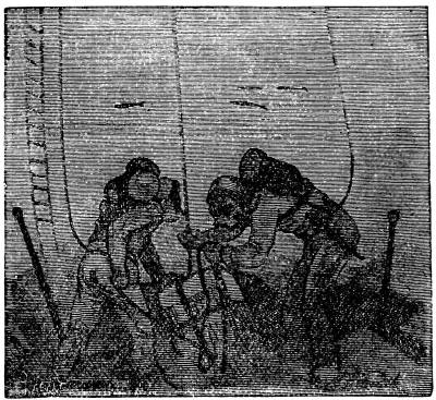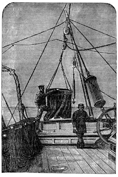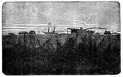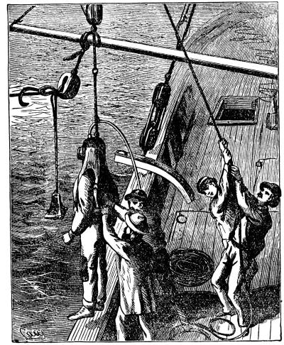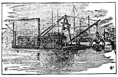 Dredging in deep water, that is, at depths beyond 200 fathoms, is a matter of some difficulty, and can hardly be done with the ordinary machinery at the disposal of amateurs. The description of the apparatus used in the Porcupine, in 1869 and '70, on her dredging cruise in the Bay of Biscay, will show what is necessary. These arrangements are also shown in the cut. This vessel, a gun-boat of the English navy, of 382 tons, was fitted out specially for this work. Amidships she was furnished with a double cylinder donkey-engine, of about twelve horse-power, with drums of various sizes, large and small. The large drum was generally used, except when the cord was too heavy, and brought up the rope at a uniform rate of more than a foot a second. A powerful derrick projected over the port bow, and another, not so strong, over the stern. Either of these was used for dredging, but the one at the stern was generally used for soundings. The arrangement for stowing away the dredge rope was such as made its manipulation singularly easy, notwithstanding its great weight, about 5,500 pounds. A row of some twenty large pins of iron, about two feet and a half long, projected over one side of the quarterdeck, rising obliquely from the top of the bulwark. Each of these held a coil of from two to three hundred fathoms, and the rope was coiled continuously along the whole row. When the dredge was going down, the rope was taken rapidly by the men from these pins in succession, beginning from the one nearest the dredging derrick, and in hauling up a relay of men carried the rope from the drum of the donkey-engine and laid it in coils on the pins, in reverse order. The length of the dredge rope was 3,000 fathoms, nearly three and a half miles. Of this, 2,000 fathoms were hawser-laid, of the best Russian hemp, 2 1/2 inches in circumference, with a breaking strain of 2 1/4 tons. The 1,000 fathoms next the dredge were hawser laid, 2 inches in circumference. Russia hemp seems to be the best material for such a purpose. Manilla is considerably stronger for a steady pull, but is more likely to break at a kink.