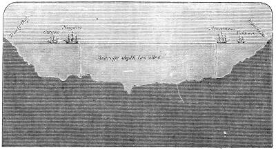 The mean depth of the whole mass of the ocean waters of the globe is estimated at about three miles, since measurements have shown that the basins of the Atlantic and Northern Pacific are deeper than this by hundreds of thousands of fathoms. The extent covered by the surface of the ocean has been estimated at more than 145,000,000 of square miles, and with this estimate, the sea is calculated to form a volume of about two and one-half million billions of cubic yards, or about the five hundred and sixtieth part of the planet itself. The highest point of the land raised above the level of the sea is much less elevated than the bottom of the sea is depressed from the same level, so that the mass of the land above this level can be estimated only at about a fortieth part of the mass of the waters.