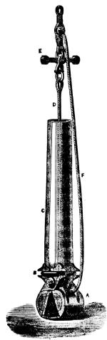 In the Porcupine both derricks were furnished with accumulators, which were found of great value. The block through which the sounding line or dredging rope passed was not attached directly to the derrick, but to a rope which passed through an eye at the end of the spar, and was fixed to a bitt on the deck. On a bight of this rope, between the block and the bitt, the accumulator was lashed. This consists of thirty or forty, or more, vulcanized india-rubber springs, fastened together at the two extremities, and kept free from each other by being passed through holes in two wooden ends like barrel heads. The loop of the rope is made long enough to permit the accumulator to stretch to double or treble its length, but it is arrested far within its breaking point. The accumulator is valuable in the first place as indicating roughly the amount of strain upon the line; and in order that it may do so with some degree of accuracy it is so arranged as to play along the derrick, which is graduated, from trial, to the number of hundred weights of strain indicated by the greater or less extension of the accumulator; but its more important function is to take off the suddenness of the strain on the line when the vessel is pitching. The friction of one or two miles[672] of cord in the water is so great as to prevent its yielding to a sudden jerk, such as is given to the attached end when the vessel rises to a sea, and the line is apt to snap.