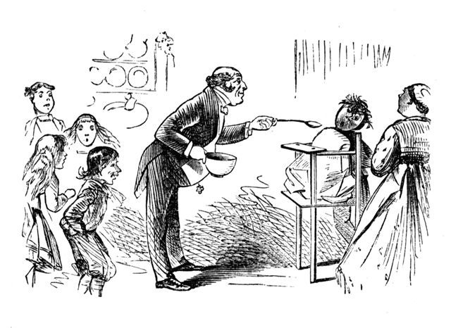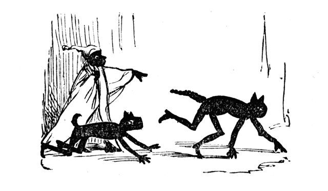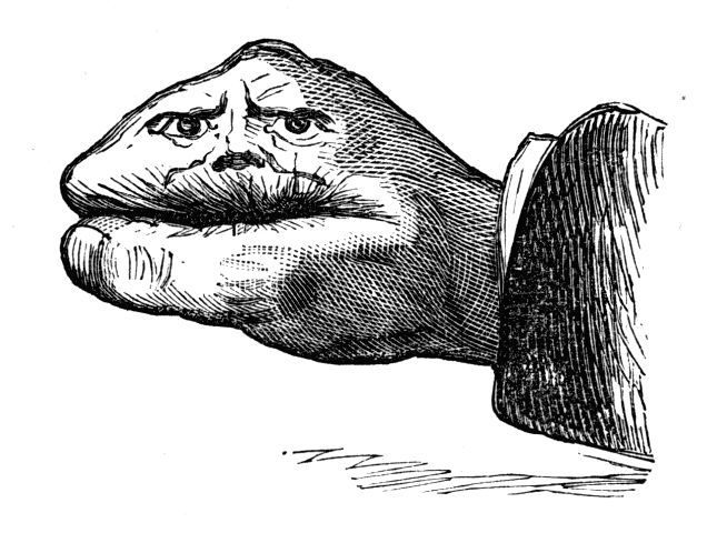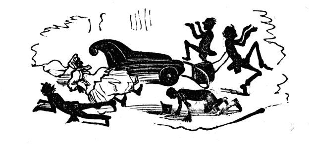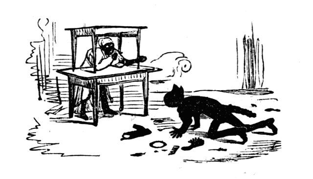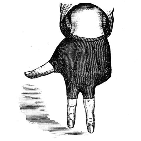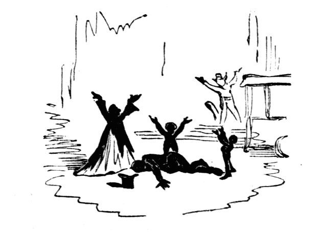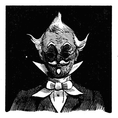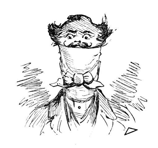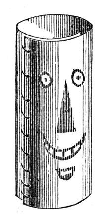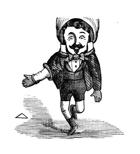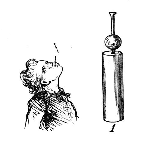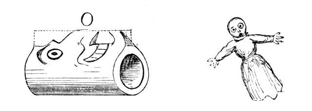 Another trick of the same order can be per[Pg 15]formed in this wise: The servant comes in to inform you that a naughty little boy—Jacky or Willy—in another room won't eat his custard, but will cry for ice-cream, or roast-beef, or alligator-soup. Every one is invited into the room to see this singular child. You find him seated on a high[Pg 16] chair, with a very dirty face, making grimaces. You take the dish of custard in one hand and a large spoon (the larger the better) in the other, and begin to expostulate with him on his perversity, but all to no effect; he only cries and makes faces. You then tell him if he does not behave better you will be obliged to knock his head off. He continues not to behave better, whereupon you give him a tap with the spoon, and, to the surprise of all, his head rolls off on to the floor. Your audience then find out that the naughty boy was made of a pillow and a few children's clothes, whilst the head was supplied by Master Jacky or Willy, ingeniously concealed behind the chair.