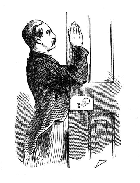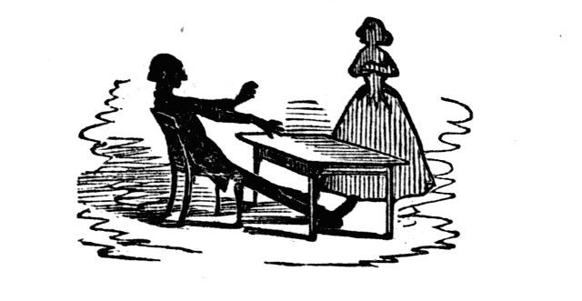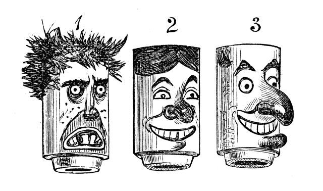 You now seat yourself opposite the subject, and desire him to keep his eyes steadily on yours, and imitate the motions of your fingers. You then commence. First, you dip your finger in the water, and draw it down the centre of your nose; he does the same; then you rub the bottom of your plate with your fingers, and draw it over your chin; he follows your example, and makes a black smudge on his face; you rub the bottom of the plate again, and draw your finger over your nose, and so on for several minutes, till the victim has smeared himself all over with black. You then rise and compliment him on the steadiness with which he underwent the ordeal, adding, however, that he has too powerful a nervous organization for you to operate on. The victim will generally rise with a rather complacent smile at these compliments, at which point the audience will generally explode with laughter. The victim looks puzzled—more laughter—the victim, thinking they are laughing at your failure, joins in the merriment, which generally has the effect of convulsing every one, when the climax is reached by handing a mirror to the unhappy operatee, who usually looks glum, and does not see much fun in the joke.