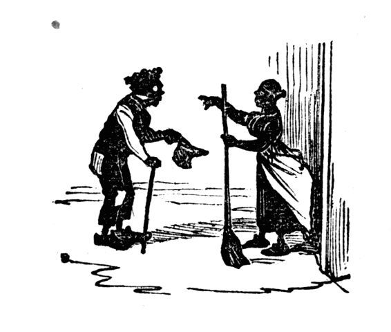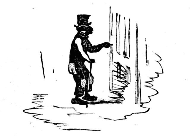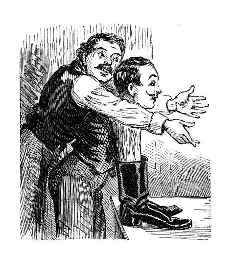 After a little conversation, you can try something which requires a little more preparation. The servant, whom you have previously instructed, comes into the room and announces that "that" gentleman has called to look at the pictures. You desire him to be shown in, and a short, broad-shouldered man makes his appearance. Soon after he enters, he turns his back on the company and begins to examine the works of art on the wall, lengthening[Pg 14] and shortening his body to suit the height of the object he wishes to inspect. This is performed by your little brother or son, aided by a broom, a couple of cloaks, and a hat. How, you will doubtless be able to understand by looking at the subjoined picture.