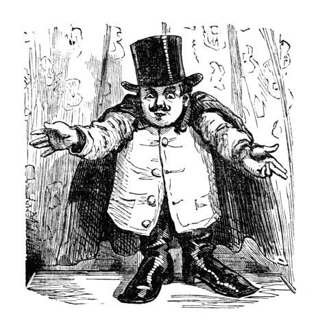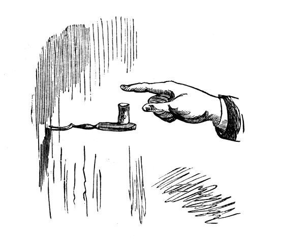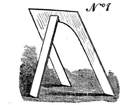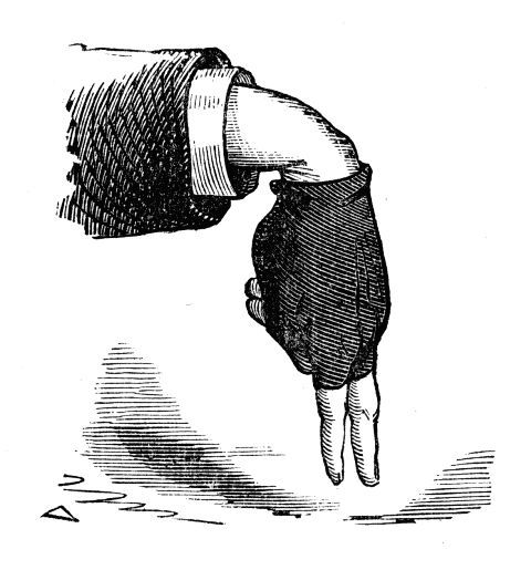 In the first place, we must remark, in a general way, that we like a large centre-table. It is something to rally round, it is handy to put things on, and convenient for the bashful to lean against. On this table I would accumulate picture-books, toys, and knick-knacks—little odds and ends which will serve as subjects for conversation. If you can do no better, make a pig out of a lemon and four lucifer matches, or an alligator out of a carrot. But we will give some detailed instructions on this point in a future chapter. Any simple puzzles, numbers of which can be made out of cards, will be found helpful. Take, for example, a common visiting-card, and bend down the two ends, and place it on a smooth table, as represented in the annexed diagram, and then ask any one to blow it over. [Pg 12]This seems easy enough; yet it is next door to an impossibility. Still, it is to be done by blowing sharply and not too hard on the table, about an inch from the card. Another little trick consists in making a coin (if such a thing is to be found nowadays) stick to the door. This is done by simply making a little notch with a knife on the edge of the coin, so that a small point of metal may project, which, when it is pressed against the woodwork, will penetrate, and so cause the dime or half-dime to appear to adhere magically to a perpendicular surface. When you have exhibited one or two tricks of this kind, some other member of the party may have something to show. Then, having secured the confidence of your audience, you may venture to play a hoax upon them. Never mind how trifling or how old these things are, they will serve the purpose of making people talk. Say, for example: "Now, ladies and gentlemen, I will show a trick that is worth seeing. There are only two people in the United States that can execute it[Pg 13]—myself and the Siamese Twins. First of all, I must borrow two articles from two ladies—a pocket-handkerchief and—a boot-jack." Of course no one has the boot-jack; so, pretending to be a little disappointed, you say: "Never mind; I must do without it. Will some gentleman be kind enough to lend me three twenty-dollar gold pieces?" Of course no one has these, either; so you content yourself with borrowing two cents. You place one in each hand, and extending your arms wide apart, assure your audience that you will make both pennies pass into one hand without bringing your arms together. This you do by laying one on the mantel-piece, and turning your whole body round, your arms still extended, till the hand containing the other coin comes over the place where you laid down the cent; then you quietly take it up, and the trick is performed.