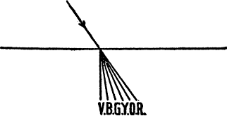 Explanation of Refraction. Perhaps the surest single method of distinguishing precious stones is to find out the refractive index of the material. To one not acquainted with the science of physics this calls for some explanation. The term refraction is used to describe the bending which light undergoes when it[5] passes (at any angle but a right angle) from one transparent medium to another. For example, when light passes from air into water, its path is bent at the surface of the water and it takes a new direction within the water. (See Fig. 1.)